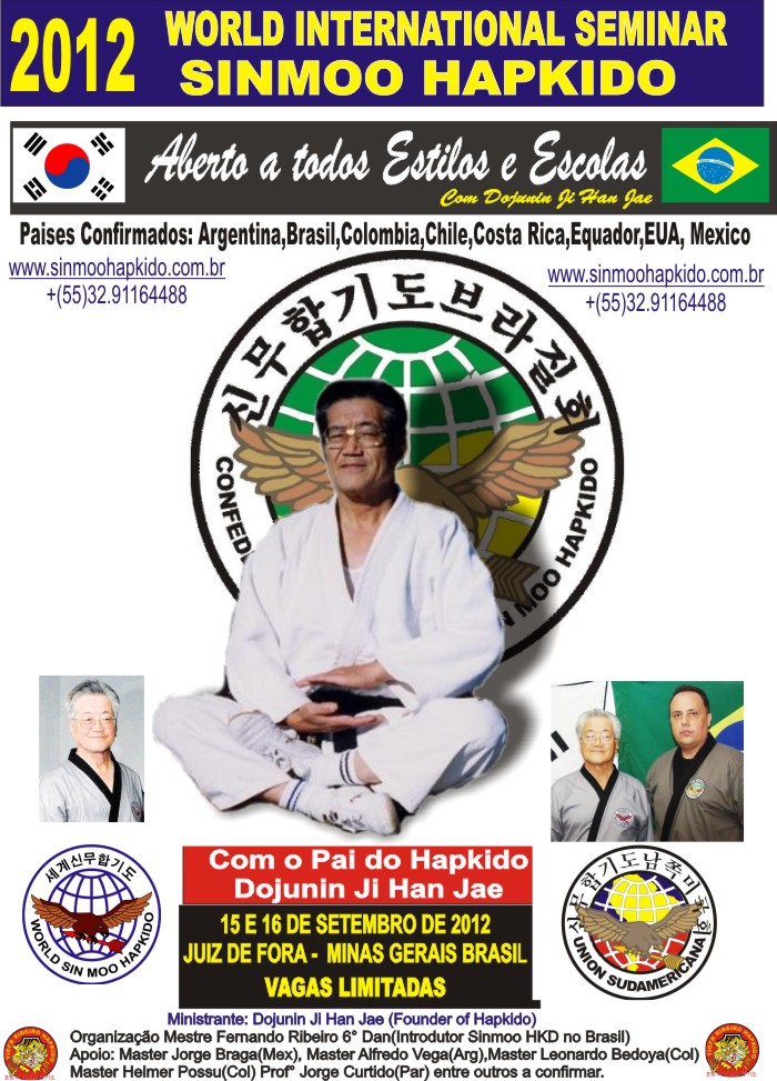 Gostariamos de informar a todos que esta CONFIRMADA a vinda de Dojunin Ji Han Jae ao Brasil nos dias 15 e 16 de setembro de 2012 ás inscrições estão abertas CLIQUE AQUI O mesmo deverá informar atraves do email presidente@sinmoohapkido.com.br ou kwanjangnin@hotmail.com o deposito efetuado no BANCO DO BRASIL AGENCIA 0024-8 CONTA CORRENTE 106.089.9 em nome da Confederação Brasileira de Sinmoo Hapkido.
